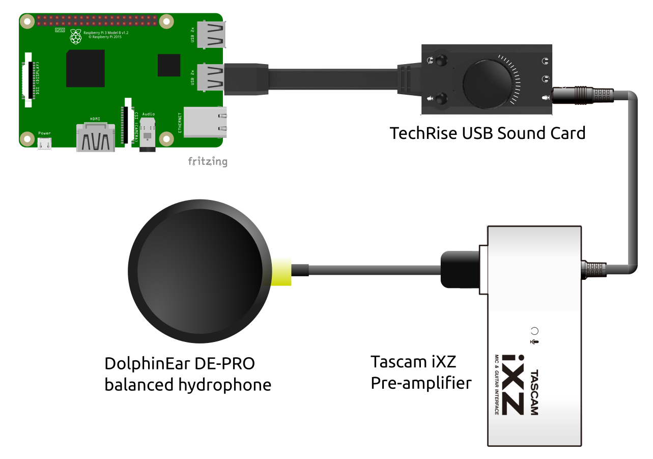 - 1 x DolphinEar DE-PRO balanced hydrophone (This is the best hydrophone we could find on a low budget (<£300) - be aware that good hydrophones can cost >£1,000, and you should choose a hydrophone that is appropriate for your interests http://www.dolphinear.com/pro.html). [£280]