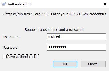 The Spartan Robotics SVN repository is hosted on svn.frc971.org. Subversion (SVN) is version control system. The 971 repository has all sorts of files including CAD and source code from the curent season and seasons back to the 2004 season. The svn.frc971.org server is a debian linux computer that was configured by and is maintained by Stephan and Michael. Stephan and Michael manage the accounts and will need to create new passwords for you before you can use it. Give us a call or ask in person for an account. Since we will be entering the password in by hand be sure and give us a password that you are comfortable with us seeing. Passwords must have letter, numbers, and a special character such as "#" or "&".
