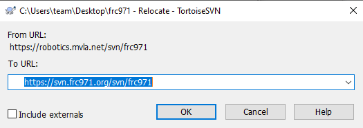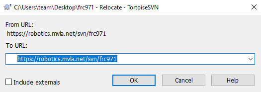 svn switch --relocate https://robotics.mvla.net/frc971/2012/trunk/src/aos https://svn.frc971.org/svn/frc971/2012/trunk/src/aos - do an "svn update" to make sure it works. If you are unable to authenticate, make sure your username is spelled properly in the ~/.subversion/auth/svn.simple directory. Change (cd) into that directory and find the file with "svn.frc971.org" in it (grep svn.frc971.org *) and make sure the username and password are correct. In particular, make sure the case is correct. "Michael" will not work for me because my correct username is "michael".
