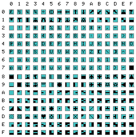 In the diagram below, the Y-axis (left) is the first digit of a two digit HEX code, and the X-axis (top) is the second digit. For example, SPACE is character code $20, while capital A is character code $41.
