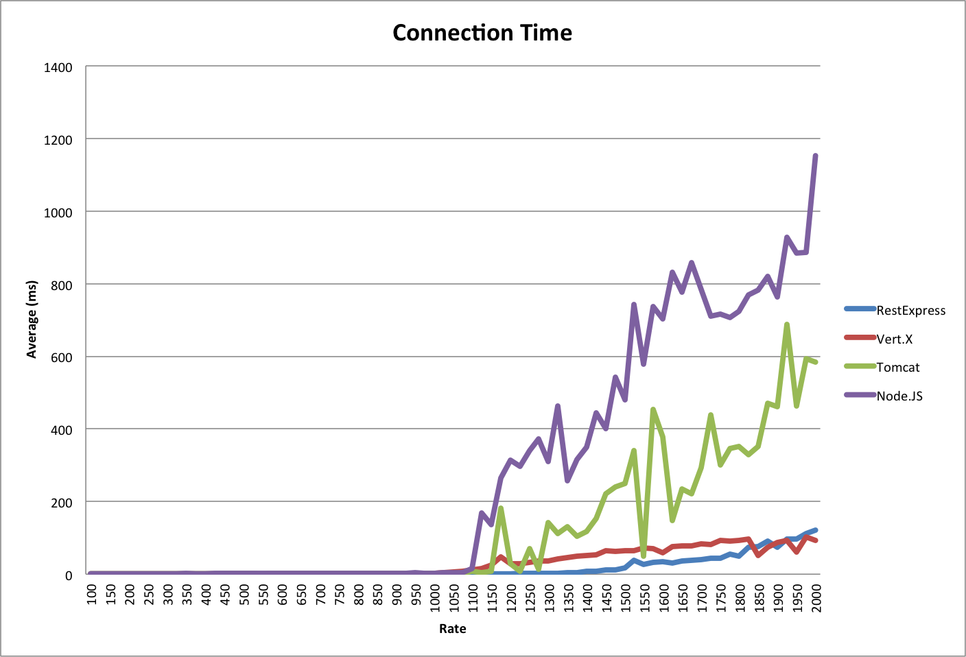 Below are some charts comparing results of the four environments. The numbers were acquired by using HttPerf over various settings of the --rate= parameter, with settings ranging from 100 to 2,000.