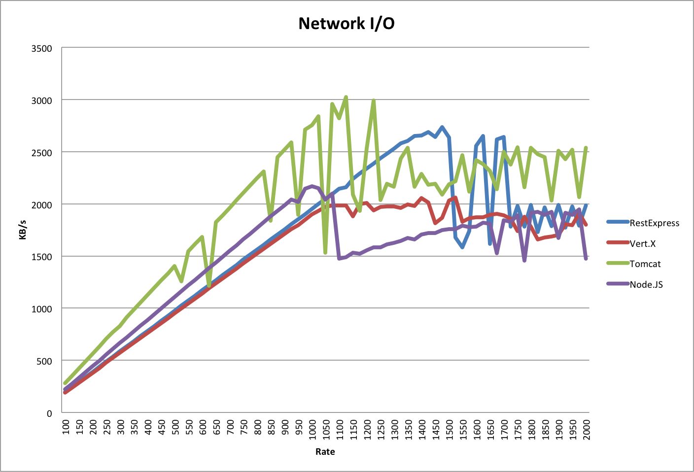 This simple benchmark compares the RestExpress Echo example application against echo implementations in three other environments. This benchmark compares RestExpress (0.8.0) to NodeJS (0.6.19), Tomcat (version 7.0.28), Vert.x (version 1.1.0 final). The client utilized a custom tuned version of HttPerf per the directions at: http://gom-jabbar.org/articles/2009/02/04/httperf-and-file-descriptors