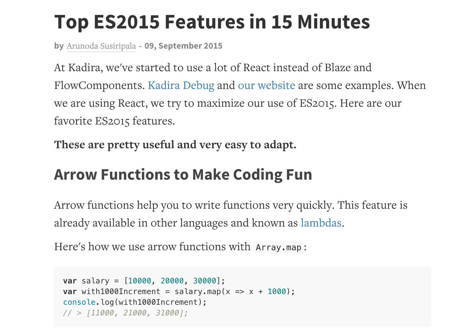 At Kadira, we've started to use a lot of React instead of Blaze and FlowComponents. Kadira Debug and our website are some examples. When we are using React, we try to maximize our use of ES2015. Here are our favorite ES2015 features.
