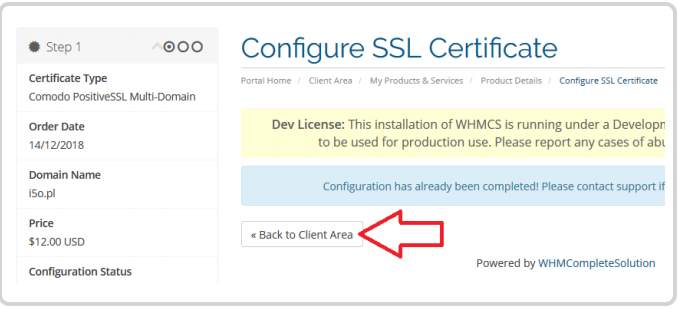 In order to replace 'Back to Client Area' button on the complete certificate configuration with 'Back to Service Details' button: