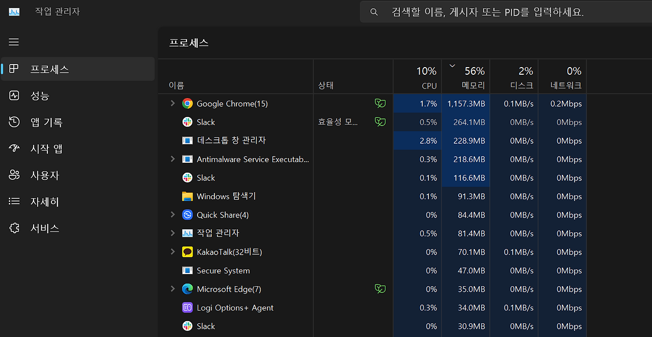 실제 프로세스를 확인해보면 내가 직접 실행한 프로그램 말고도 여러 프로세스가 실행되고 있다.