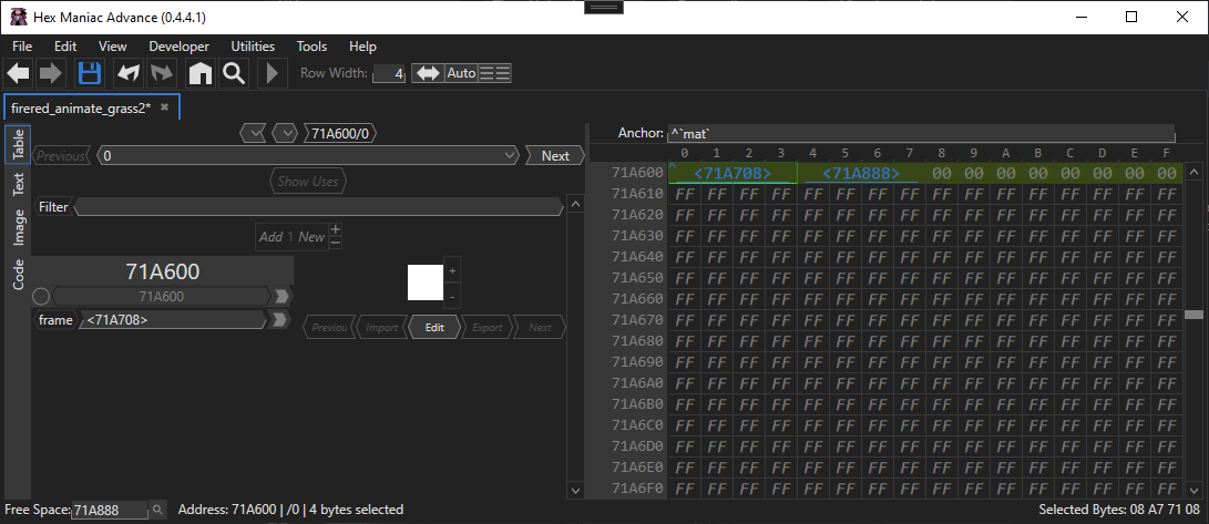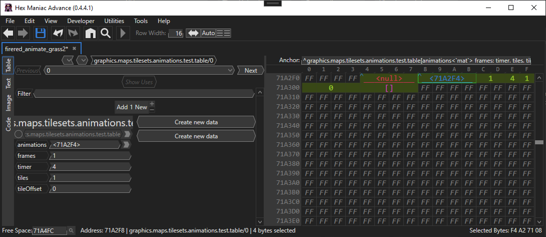 (3) HexManiacAdvance will automatically jump to your new table, which will be named graphics.maps.tilesets.animations.<yourname>.table. This table will host the information about how you want your tileset to animate.