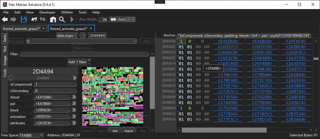 Certain tiles in the game are animated as you move around, like waterfalls, flowers, and the beach. These animated tiles are stored separately from the tileset graphics and often hard to edit. But with the Tileset Animation Adder, HexManiacAdvance allows you to add entirely new tileset animation routines by introducing a new table for it.