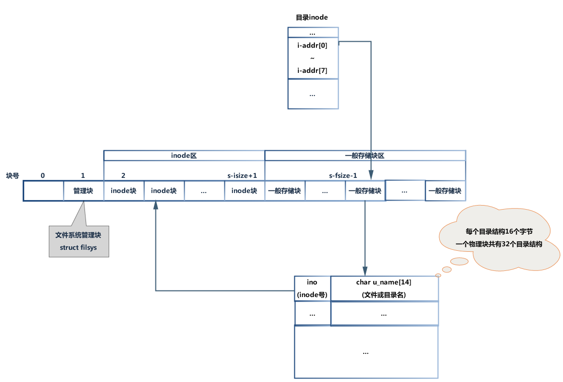 - 磁盘中每个inode结构长度为32个字节,一个磁盘块为512字节,可存放16个inode
