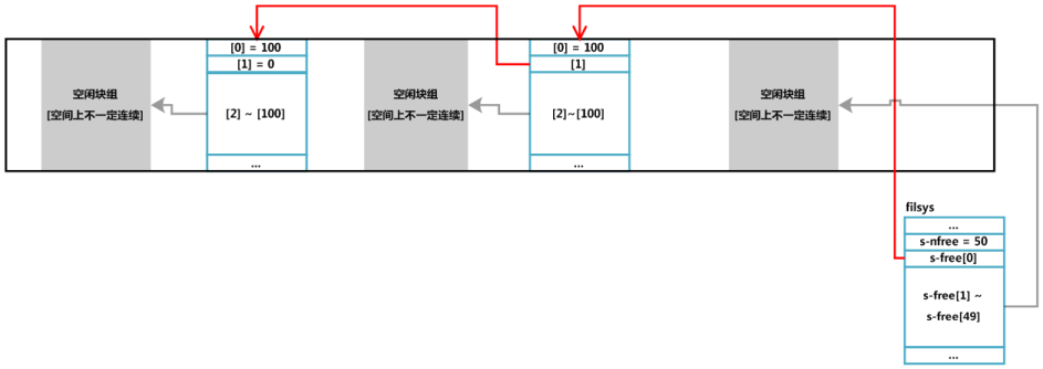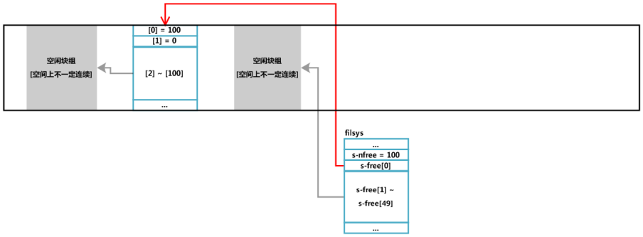 - 根据s-free[0]的指针找到上一个管理块,并将其前101个字复制到filsys结构,此时filsys取代了这个管理块的作用,如图