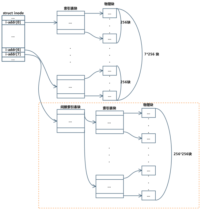 - [7]指向间接索引表块,每个间接索引表块指向256个索引表块,每个索引表块指向256个物理块