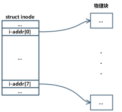- INODE结构 i-addr数组每个元素直接指向物理块
