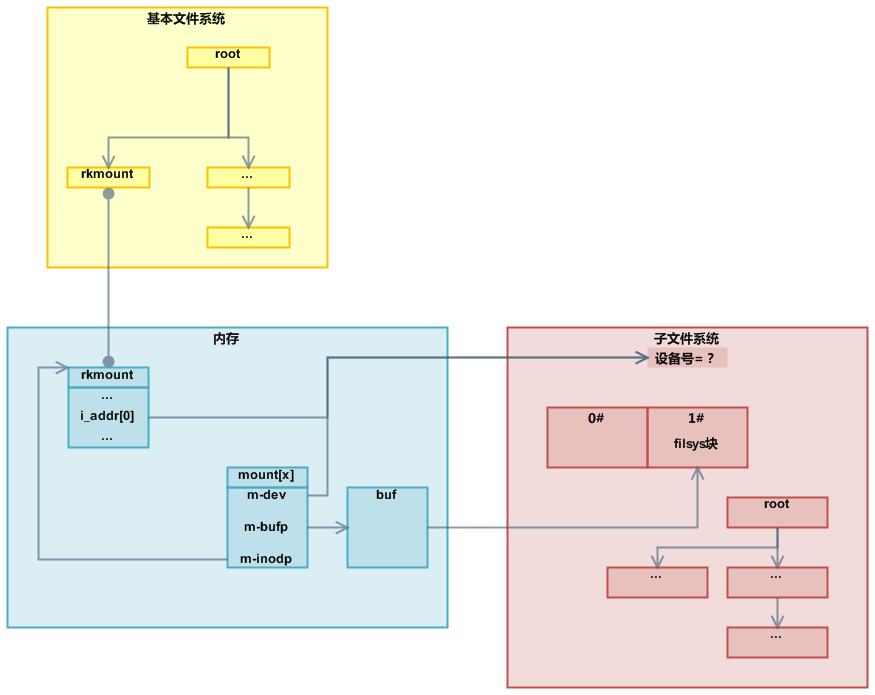 - rkmount INODE块的i_addr[0]存放子系统设备号