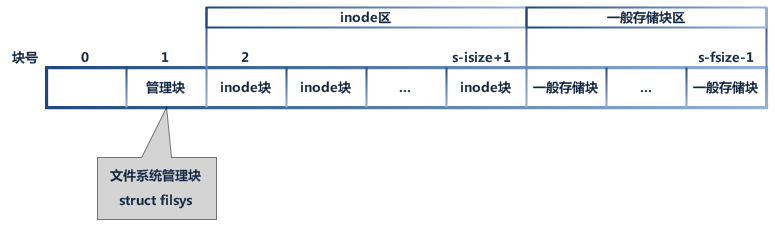 - 磁盘的第1块 ,称为超级块,结构为struct filsys,用于管理文件系统