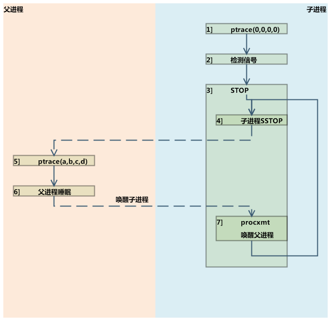 唤醒父进程,等待父进程响应 - 从3] - 7],构成 一个跟踪过程,不断循环