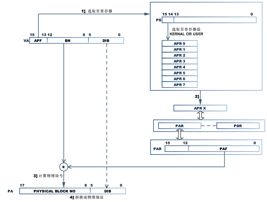 3] 选取的页寄存器[APR]中的页地址寄存器[PAR]的0-11位,加上虚地址中块号[BN]段,形成物理块号[PBN]