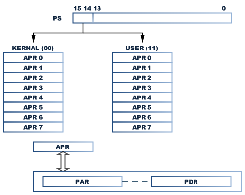 - PDP-11提供两组页寄存器,分别对应核心态和用户态(由PS状态字选择)