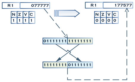 ===Coden===若 运算结果的低位字节的最高位[末第8位]被置位,则置位