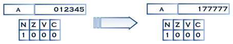 标志位N被设置,目标A数据置为-1,补码表示为177777
