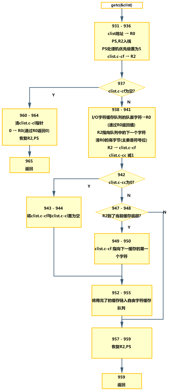 - 若I/O字符缓存队列的队首指针为空,表明缓存队列为空,跳转至960行