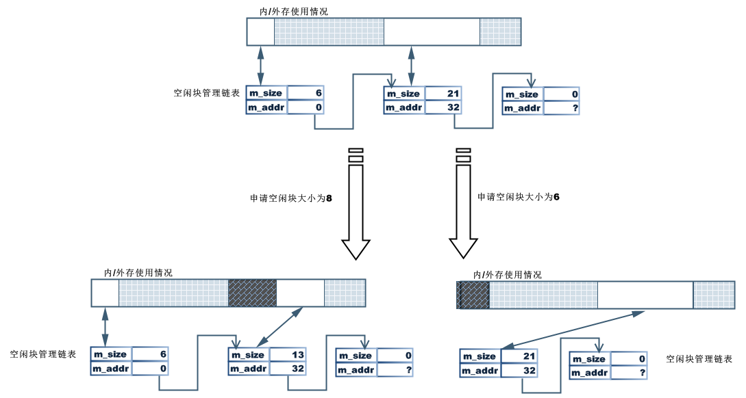 - 若分配成功,返回分配空闲块的首地址;否则,返回0