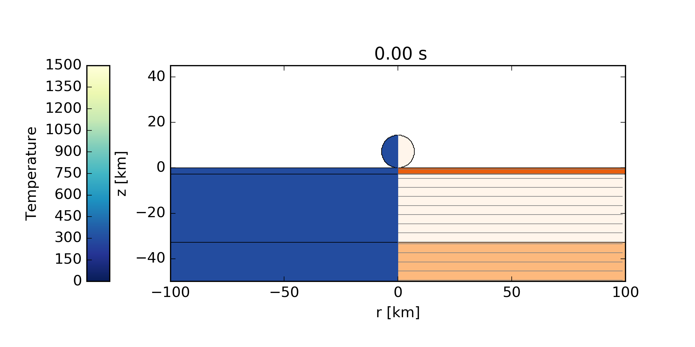 The model is similar to those described by Ivanov (2005), Collins et al. (2008) and Christeson et al. (2009), which provided a reasonable fit to observational constraints. This test case model differs because (a) different AF parameters to those used in other models are assigned to the mantle, crust and sediments; and (b) no geotherm is set in this example - the target has a constant temperature of 293K.