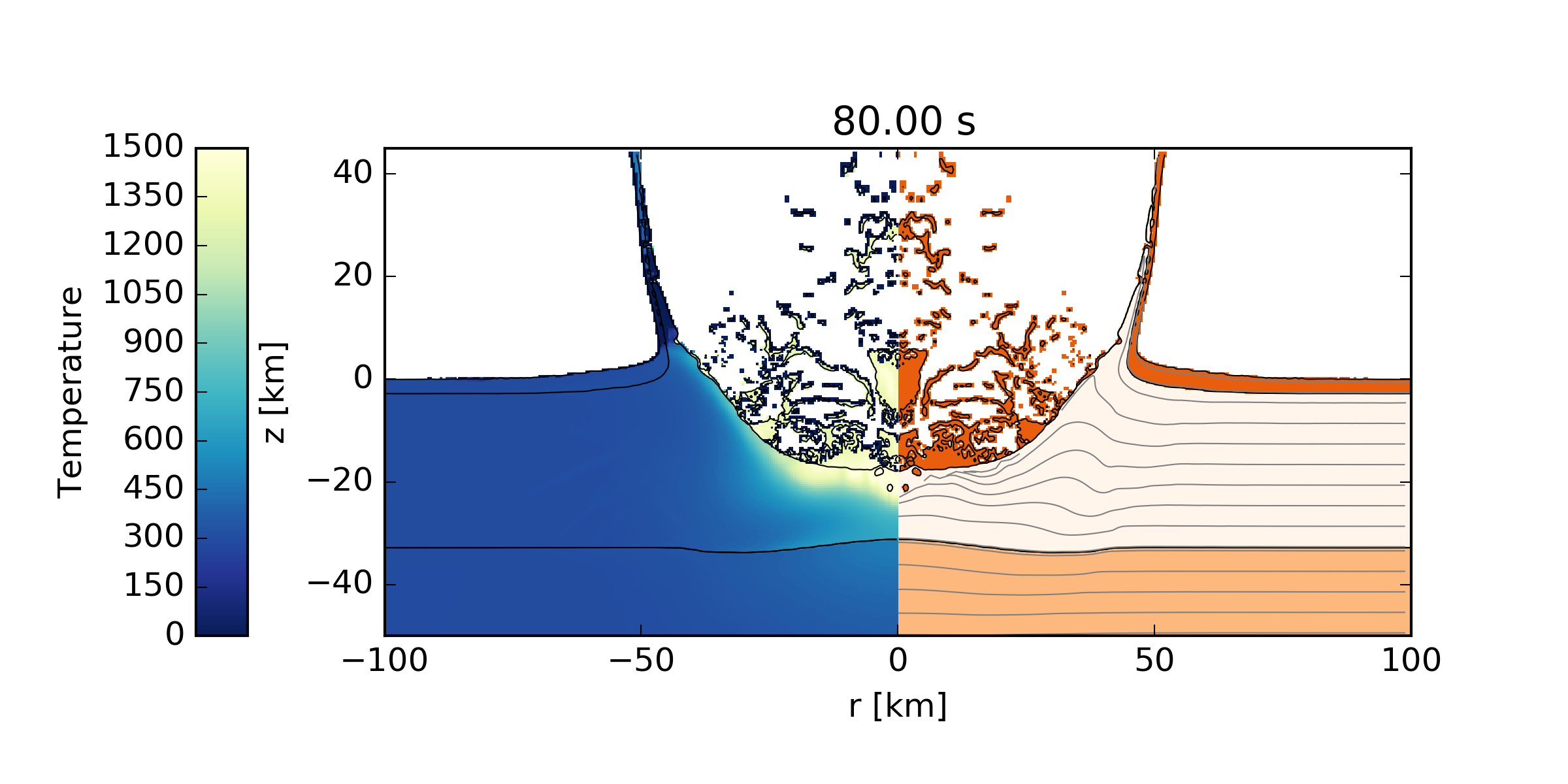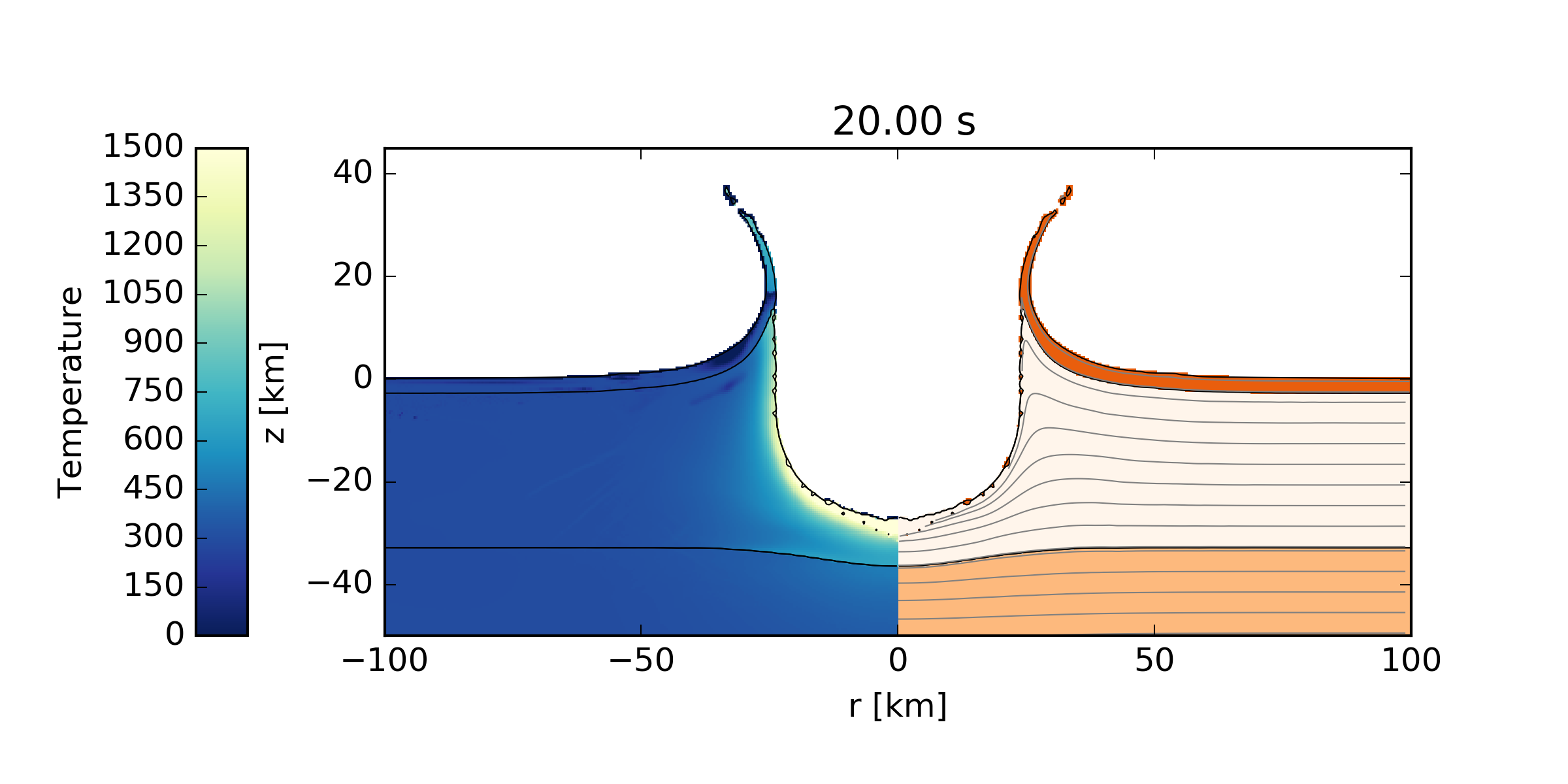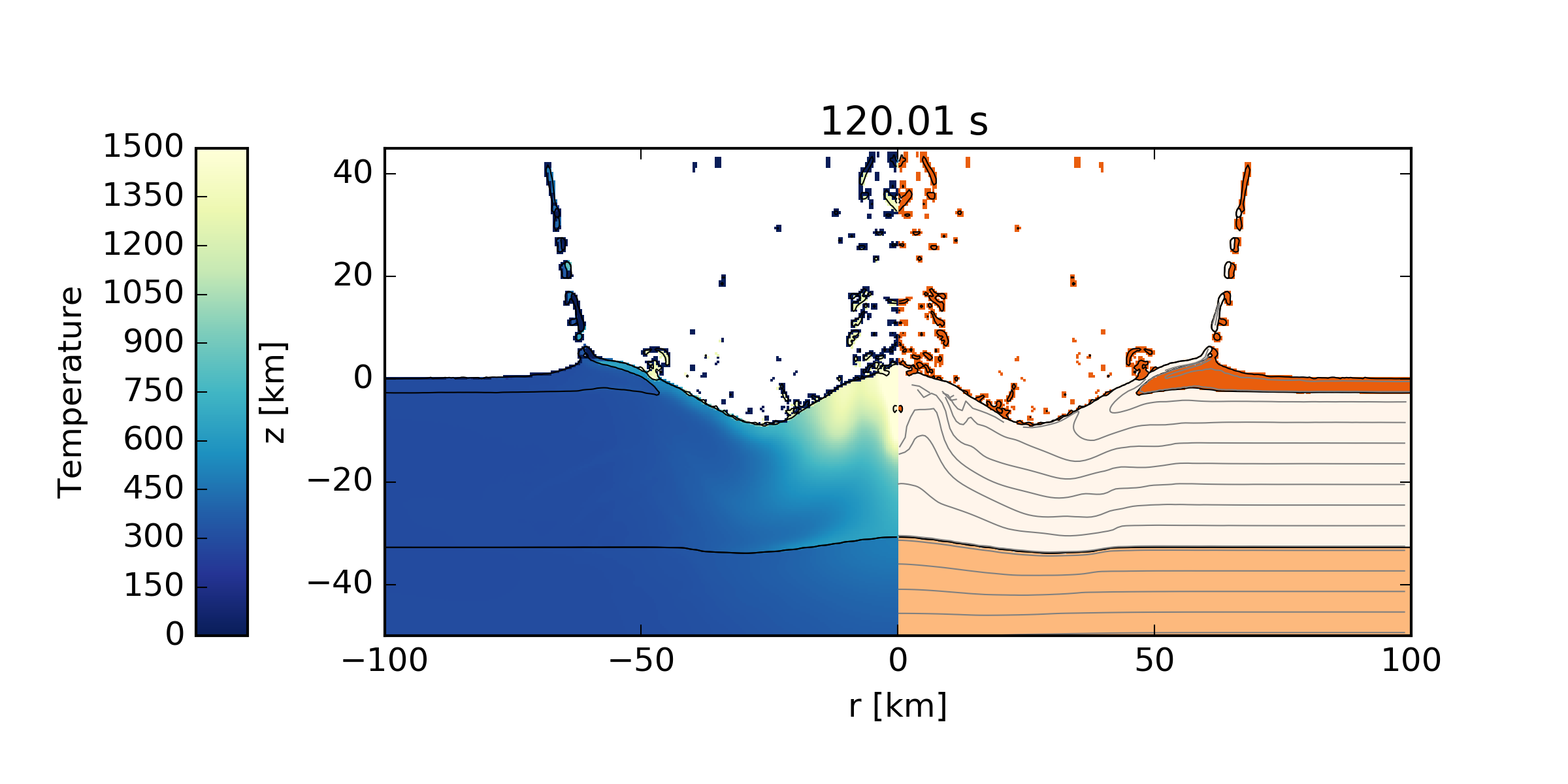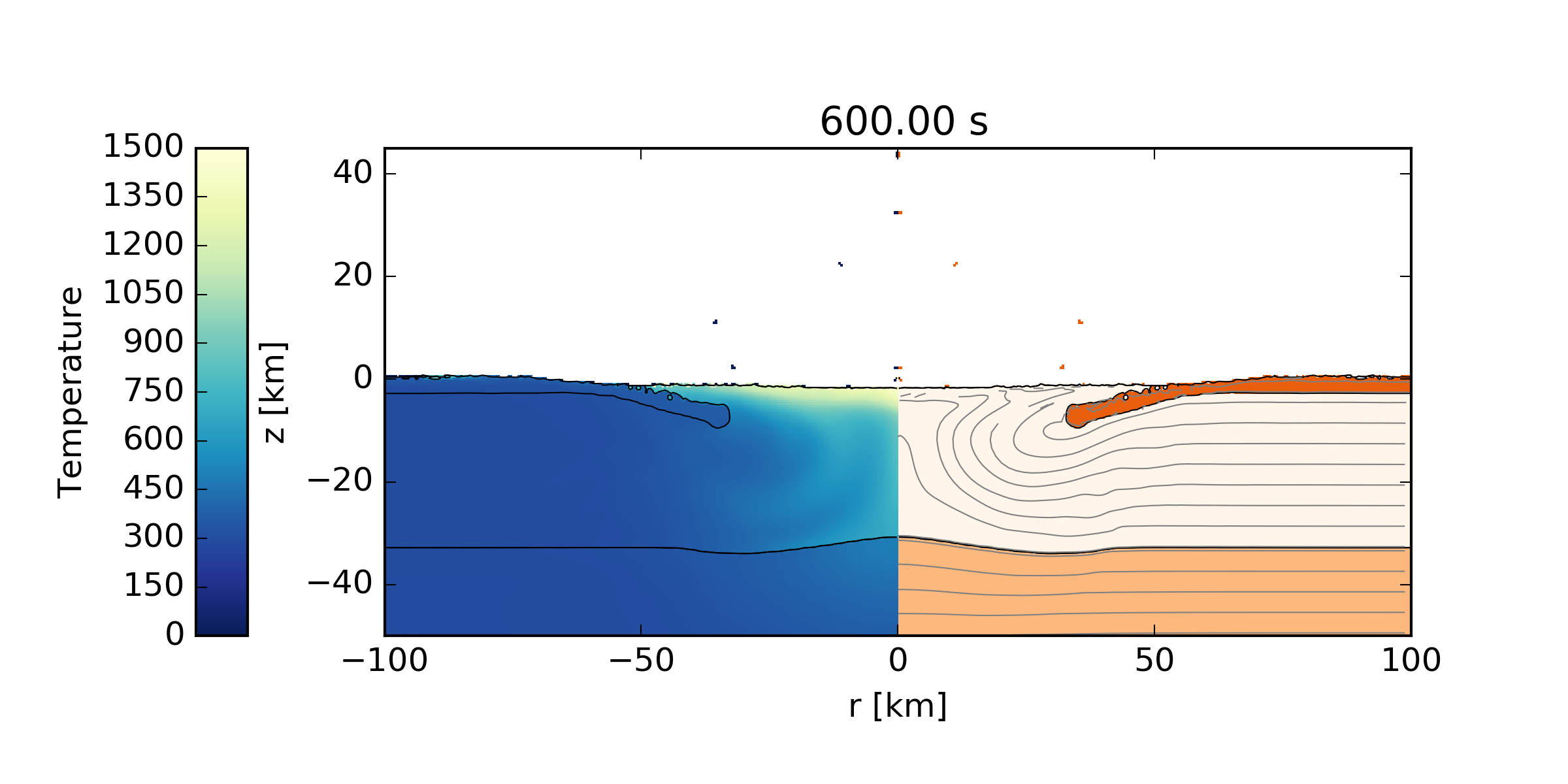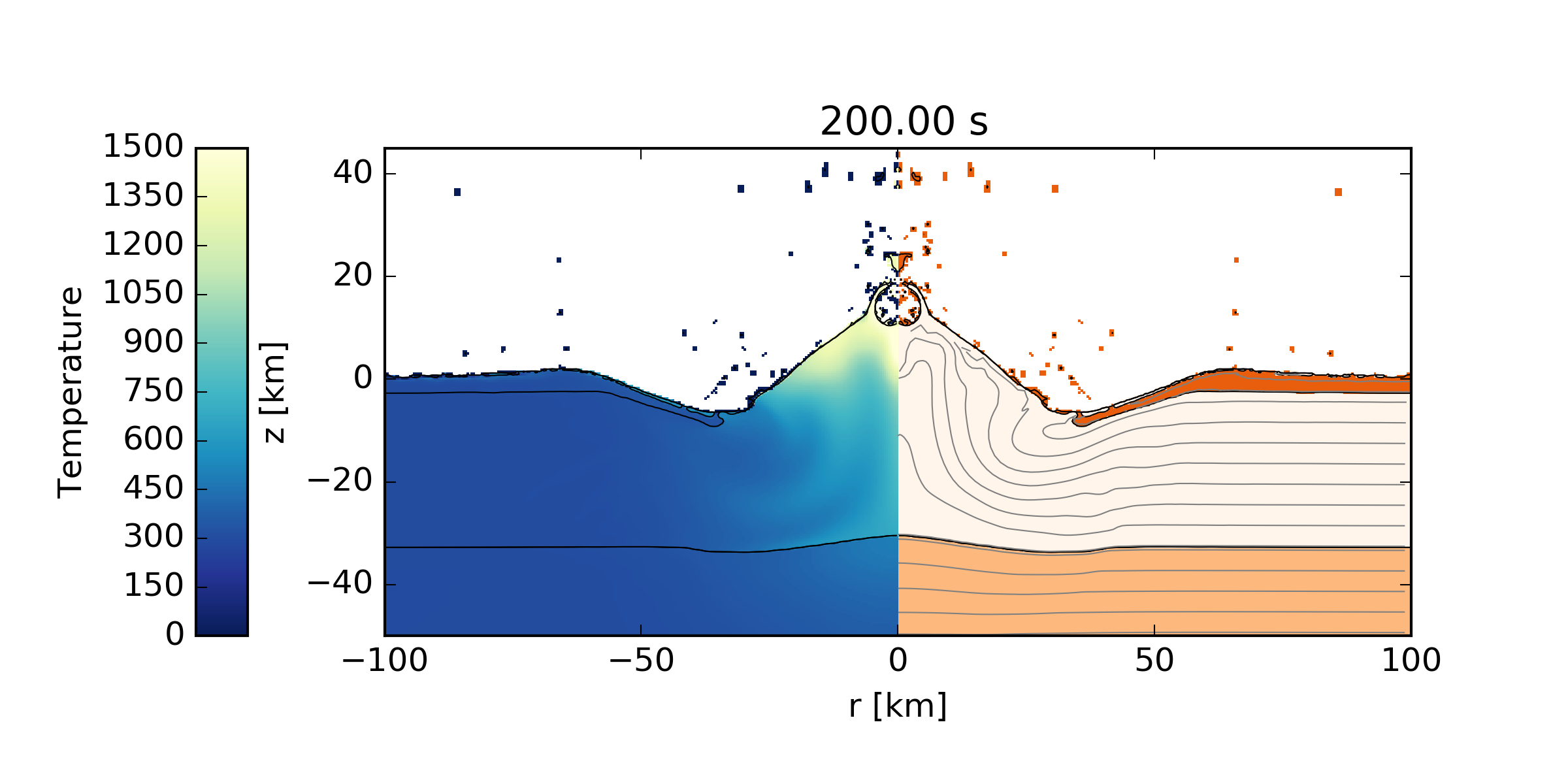 The images, which should be identical to those shown below, will be output to the directory MatTmp/. The pySALEPlot plotting scripts (see also <prefix>/share/examples/Chicxulub/Plotting/YldYAc.py) can easily be modified to generate additional images and analysis.