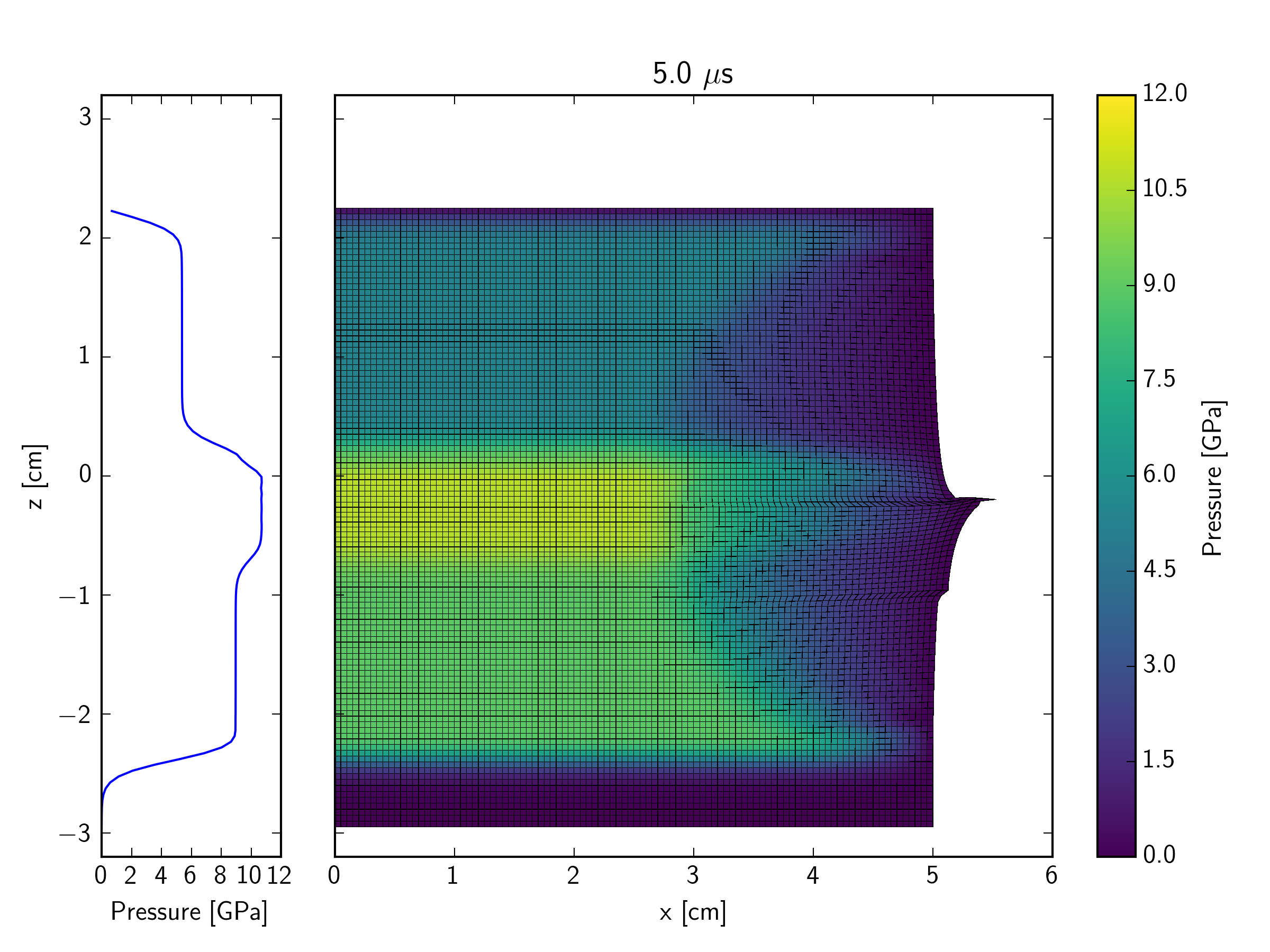 This example illustrates the limitations of the Lagrangian approach for simulating high-deformation processes. It can be used as a template for simple numerical planar-impact experiments analogous to laboratory plate impact experiments. However, note that in this example the strength of each material is neglected.