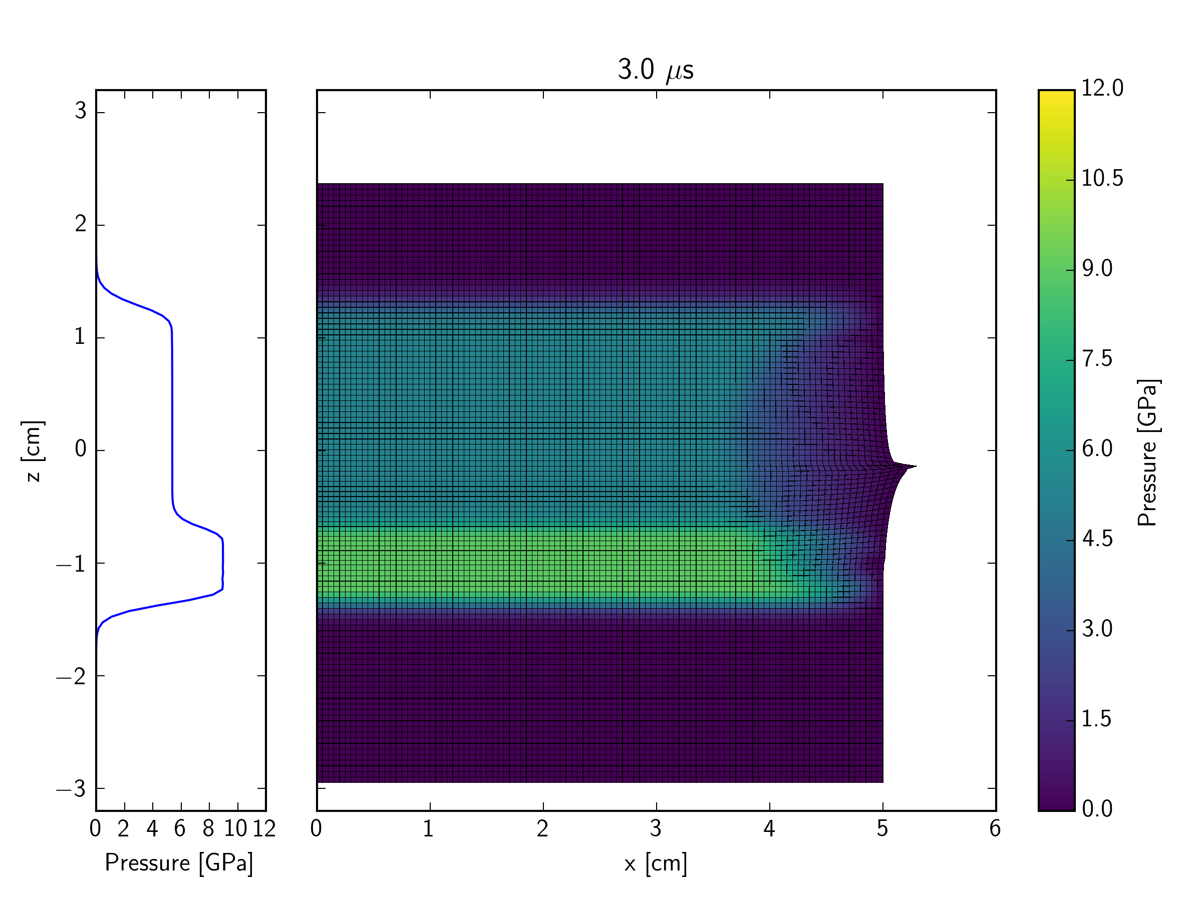 This example simulates, in a Lagrangian representation, the impact of an iron plate hitting a quartzite target at 600 m/s, with an iron buffer plate behind the target. The impact initiates a shock wave which travels through the quartzite target. At the interface between the back of the target and an iron buffer plate, the shock wave reflects back into the target and transmits a shock wave into the buffer. As the initial shock wave reaches the back of the impacting plate, a release wave is sent back through the impactor, and into the target. In contrast to the Eulerian simulation, the right edge of the mesh in the Lagrangian version is a free surface. This implies that a release wave is also generated at the edge of contact plane between the impactor and target; this propagates in towards the symmetry axis at the same time that the shock is propagating into the target and projectile.