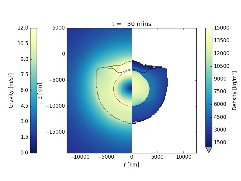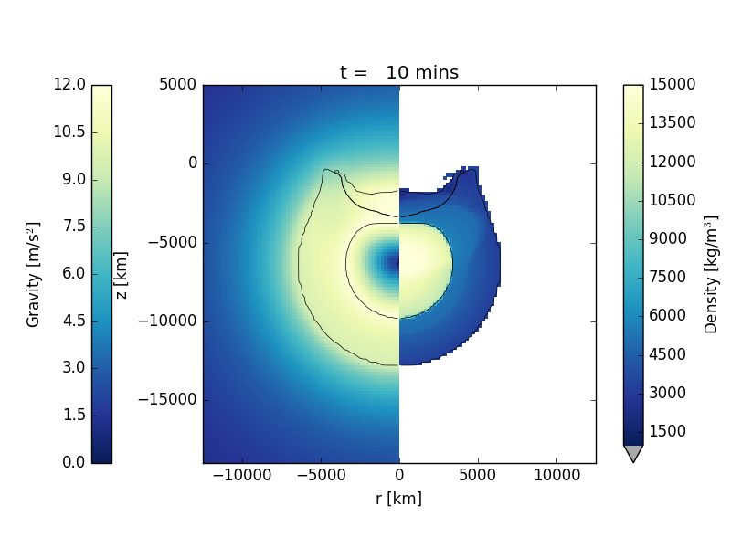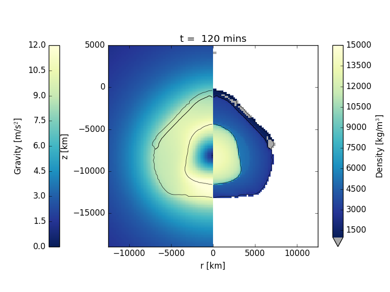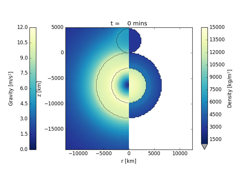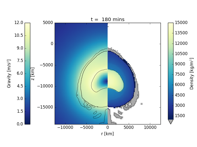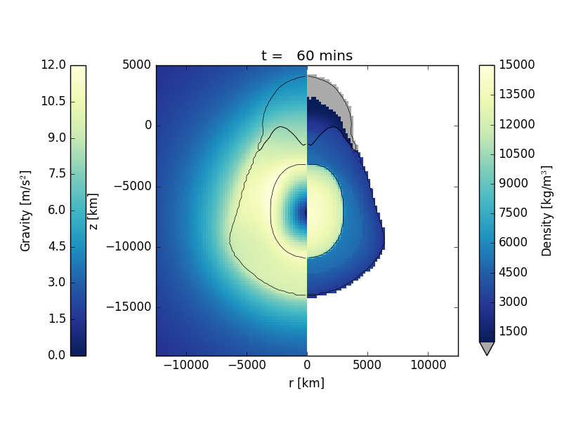 The model is a low-resolution model of an impact of a 4800 km diameter proto-planet striking the Earth head on at 12 km/s. The mantle of Earth is represented using a dunite material model; the impactor is represented by a basalt material model and Earth's core is represented by an iron material model. The gravity field for Earth is computed during start-up to be thermodynamically self-consistent with the pressure, density and temperature of Earth's interior. From this point on, the gravity field in the mesh is updated every 10 timesteps using iSALE's self-gravity algorithm. Each material's equation of state is defined using ANEOS-derived tables. The simulation terminates after 3 hours at which time Earth is still oscillating in response to the impact.