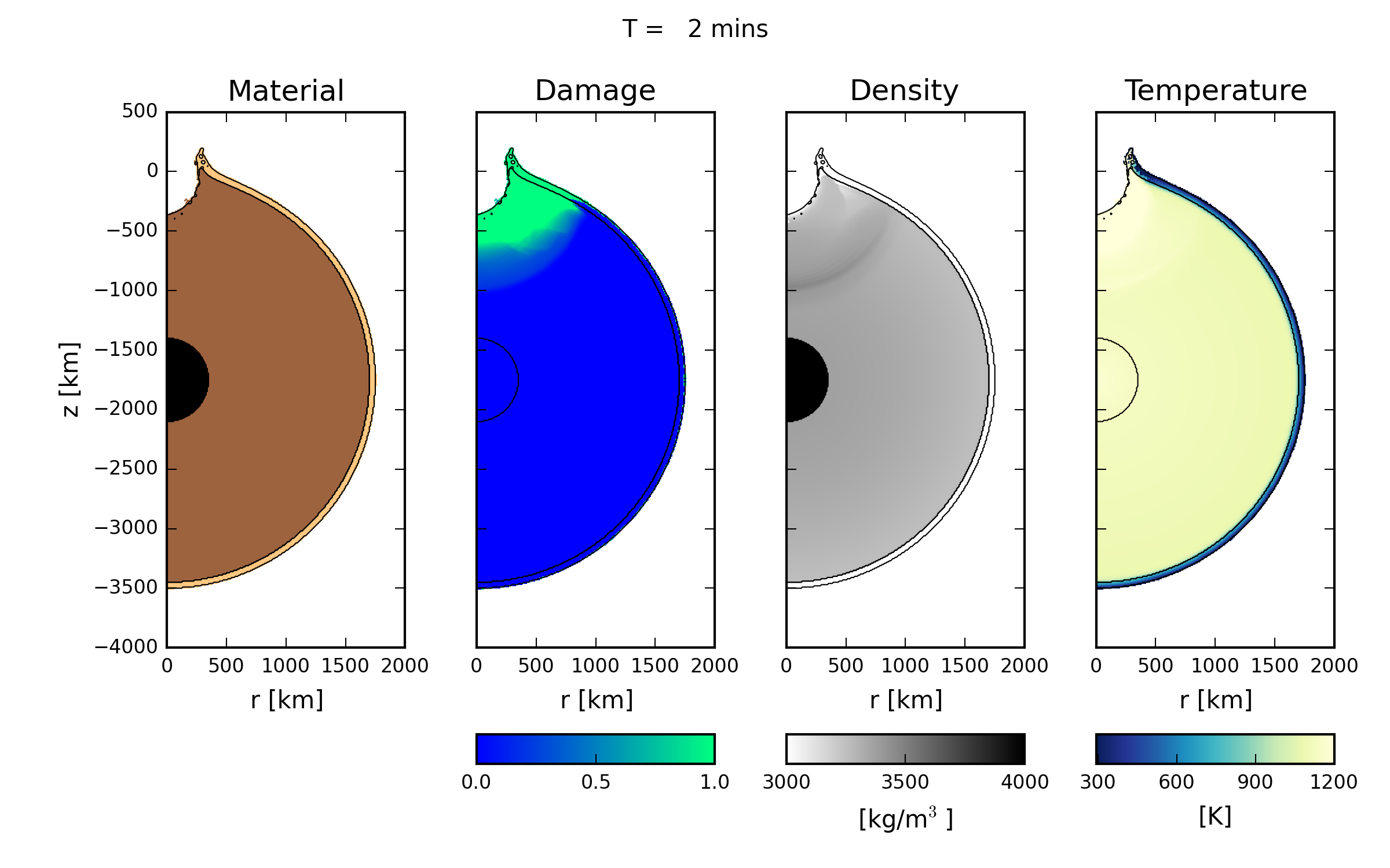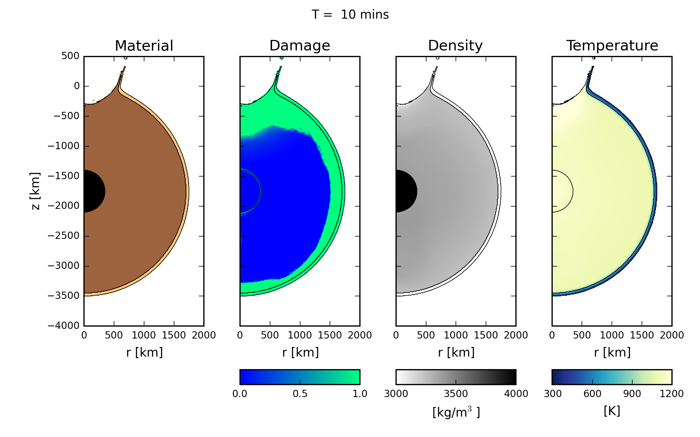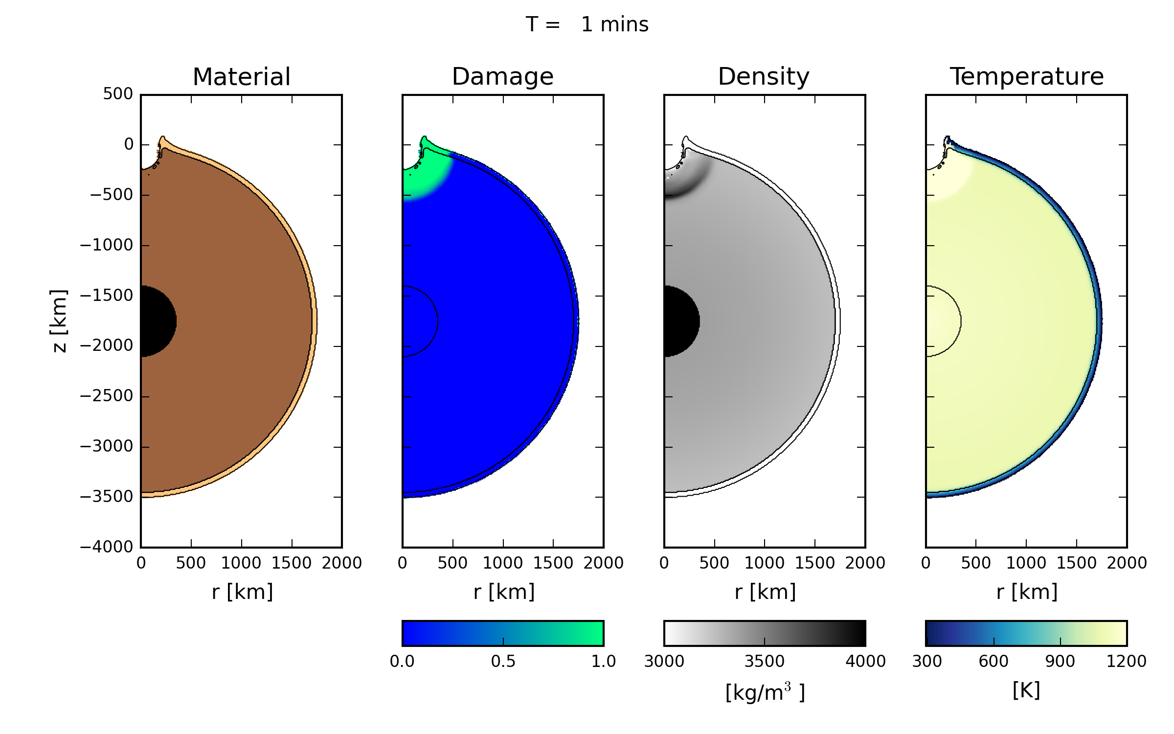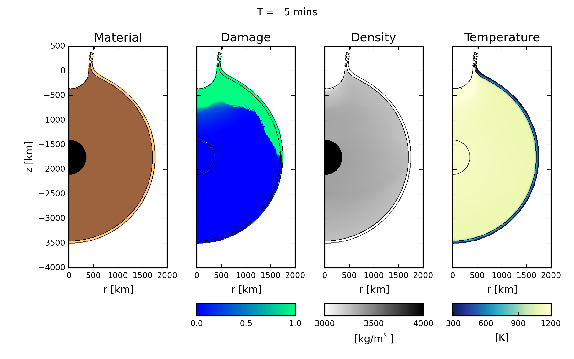 The figures below show a time series of the formation of the crater: (a) at the initial state (b) after 1 min (c) after 2 mins (d) after 5 mins (e) after 10 mins. From left to right, the panels display the material type (crust/mantle/core); damage, density and temperature.