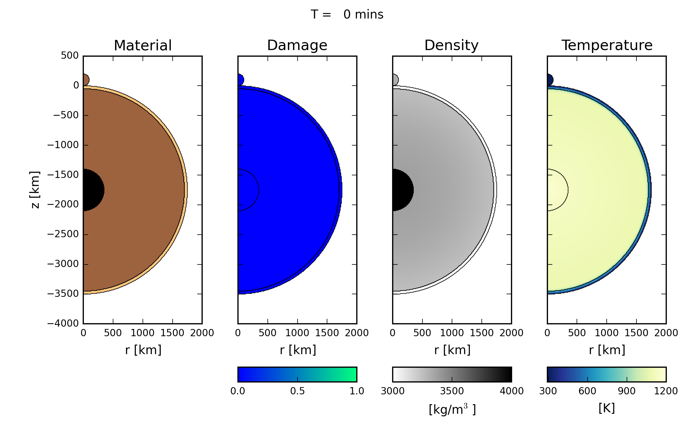 The model is a low-resolution model of an impact of a ~200 km diameter asteroid striking the Moon at 12 km/s. The impactor and the mantle of the moon are represented using a dunite material model; the lunar crust is represented by a basalt material model and the lunar core is represented by an iron material model. The gravity field for the moon is computed during start-up to be thermodynamically self-consistent with the pressure, density and temperature of the Moon's interior. Each material's equation of state is defined using ANEOS-derived tables. Acoustic fluidization (AF) is used to weaken the target and facilitate complex crater collapse, although on this scale its role is minor. The simulation terminates at the end of the excavation stage; to simulate the collapse stage as well users should extend the simulation time to approximately 7200 seconds (2 hours).
