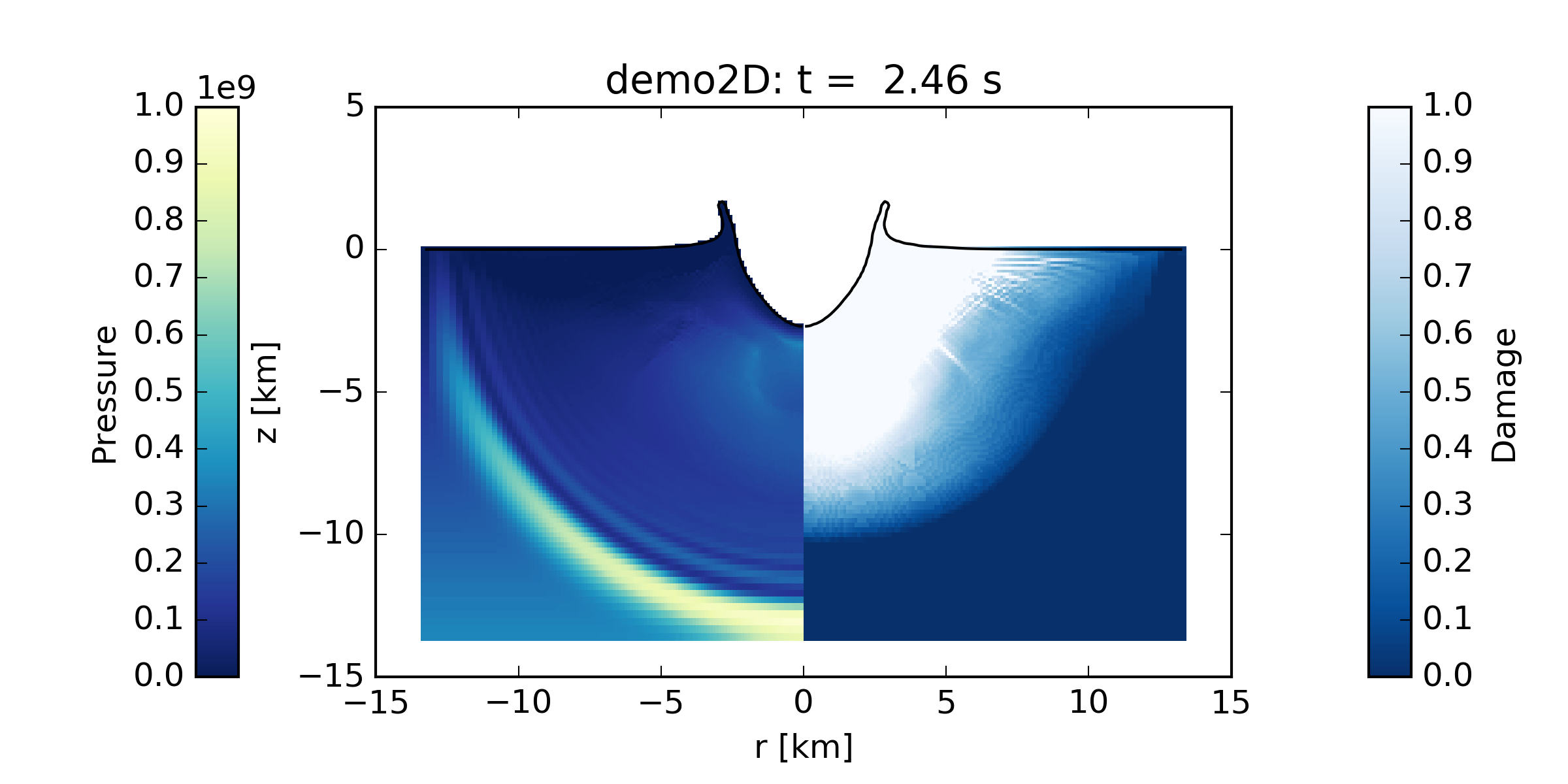 The images below display the starting simulation conditions (before impact, t=0s), and simulation stills at t=1.2s and t=2.5s. The scalar damage parameter, a measure of the extent of fracturing, is plotted on the right; pressure is shown on the left. The simulation follows the propagation of the shock wave to the edge of the domain and the target fracturing behind the shock. Crater growth has not terminated at the end of the simulation.