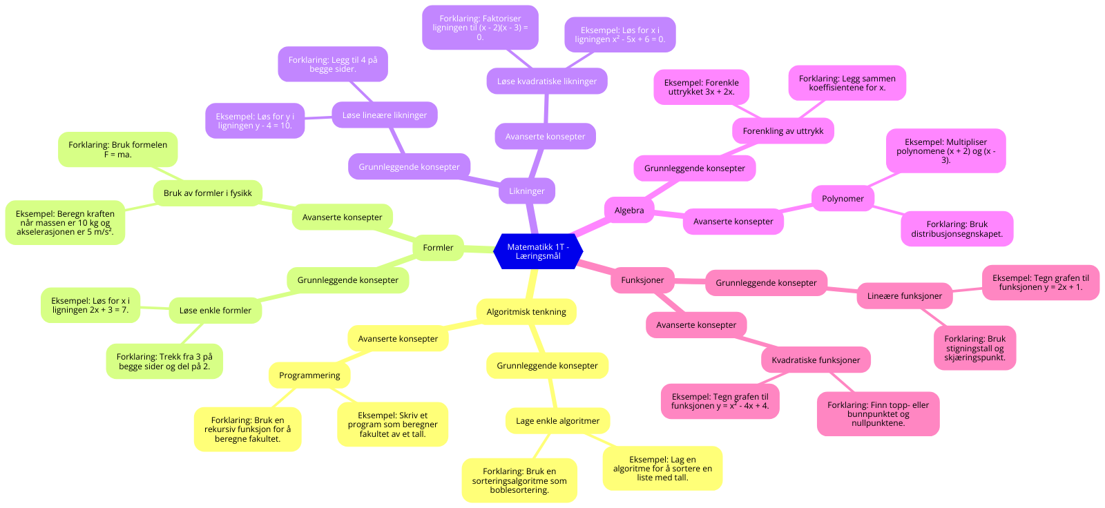 | Algoritmisk tenkning | Algorithmic thinking | Lage algoritmer for å løse problemer | Pseudokode eller programmeringsspråk | Definere algoritmer | Bruke eksempler som sorteringsalgoritmer | Lage og implementere algoritmer | Trekke ut steg-for-steg prosesser | Bruke i datavitenskap og matematikk | WolframAlpha - Algorithm |
