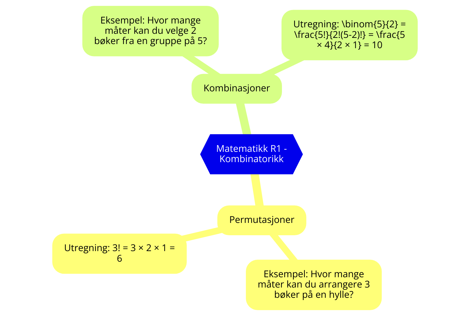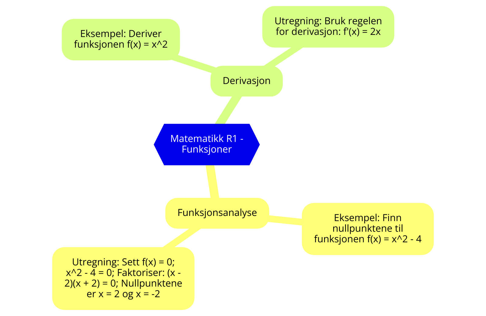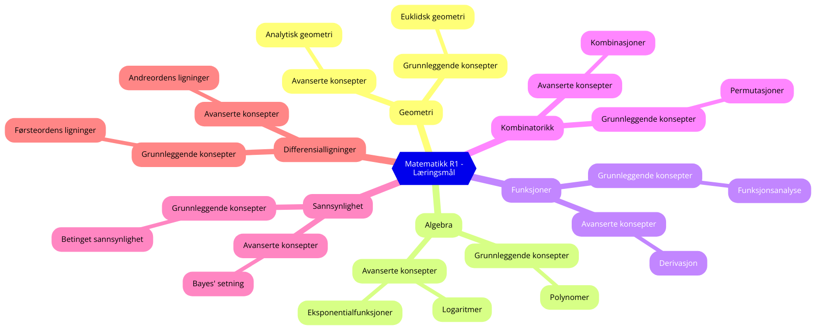 Her er tankekartet som illustrerer emner, begreper og konkrete eksempler for matematikk R1: