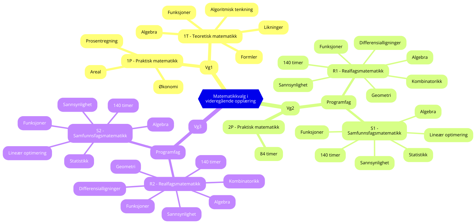 Her er tankekartet som illustrerer matematikkvalgene i videregående opplæring, inkludert detaljer om hver type matematikk: