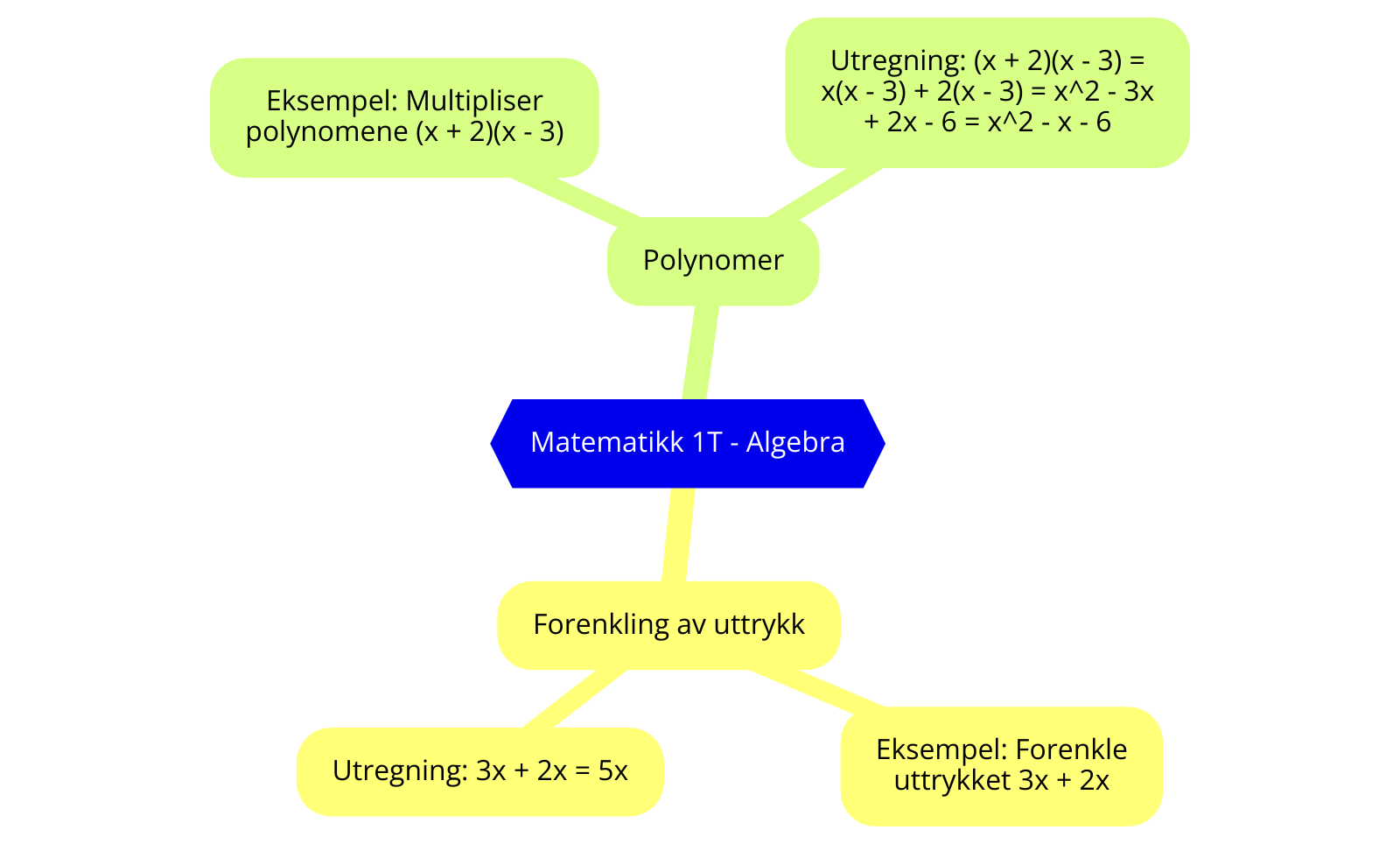 Her er tankekartet som illustrerer emner, begreper og konkrete eksempler for matematikk 1T: