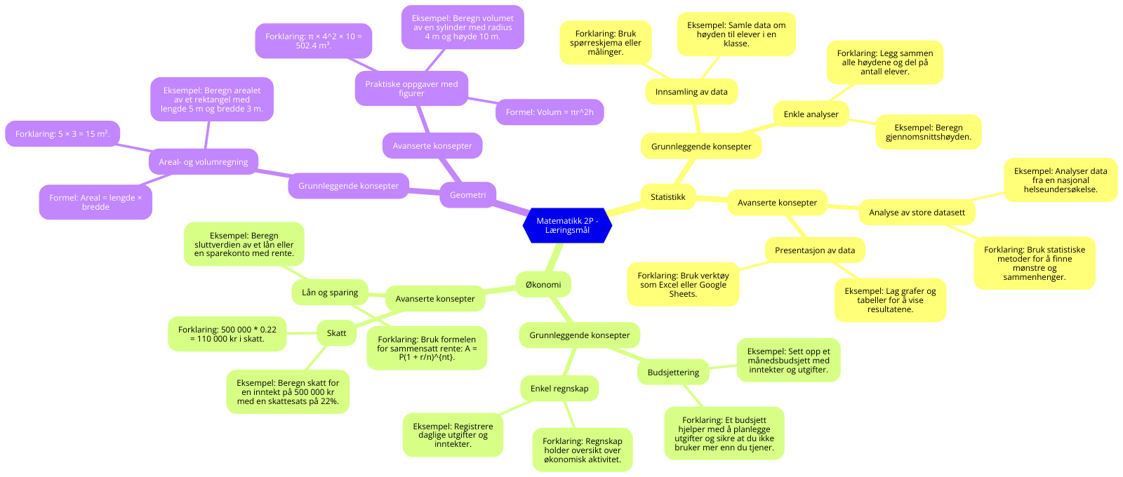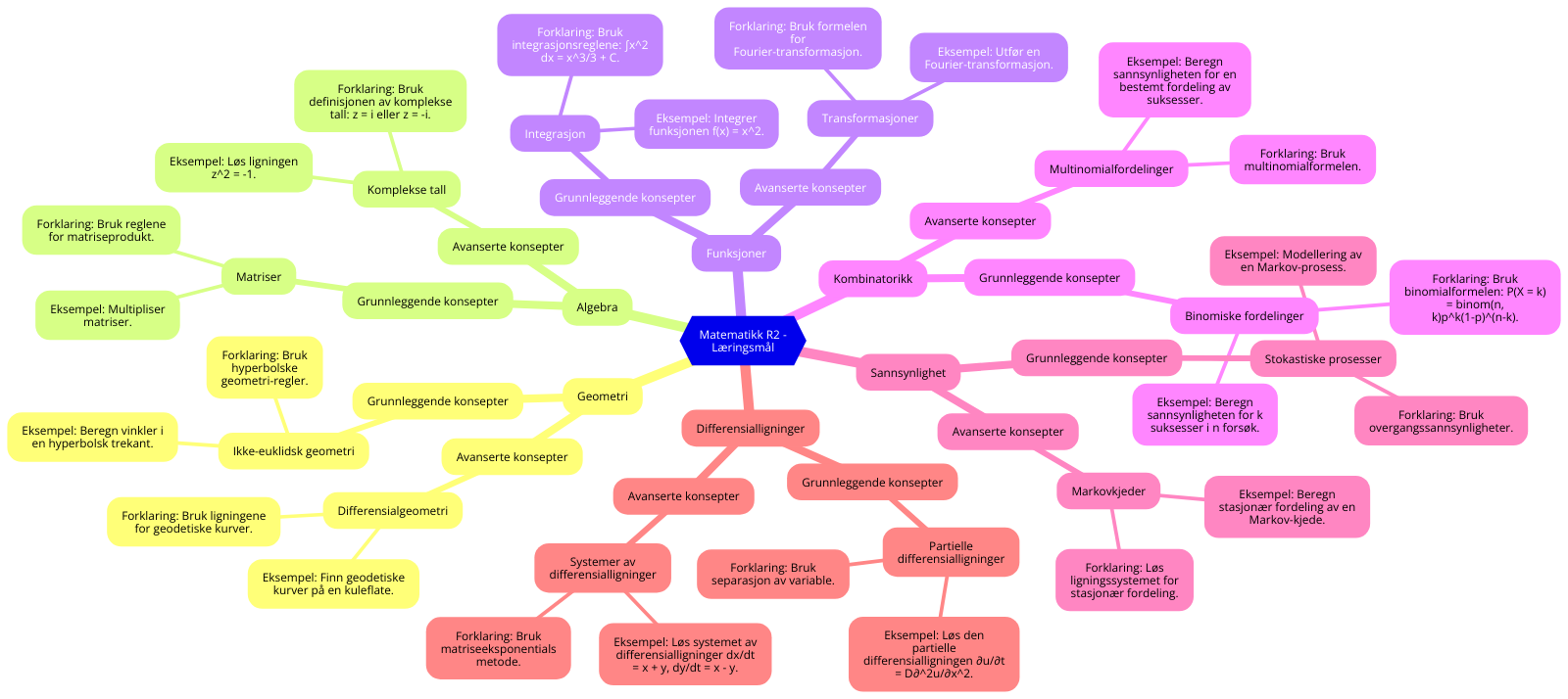 Alle matematikkfagene fra videregående opplæring er nå dekket med egne tankekart som inkluderer emner, begreper og konkrete eksempler. Hvis det er ytterligere detaljer eller spesifikasjoner du ønsker å inkludere, kan vi legge til dem. La meg vite om det er noe mer du vil ha justert eller utforsket!