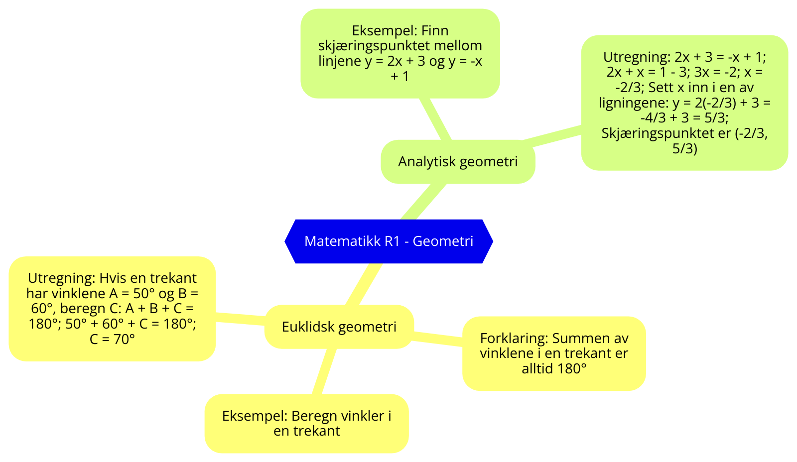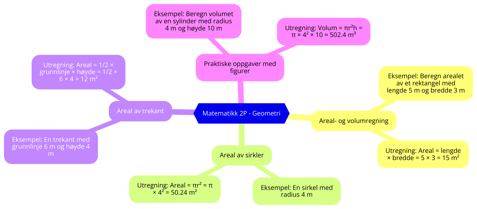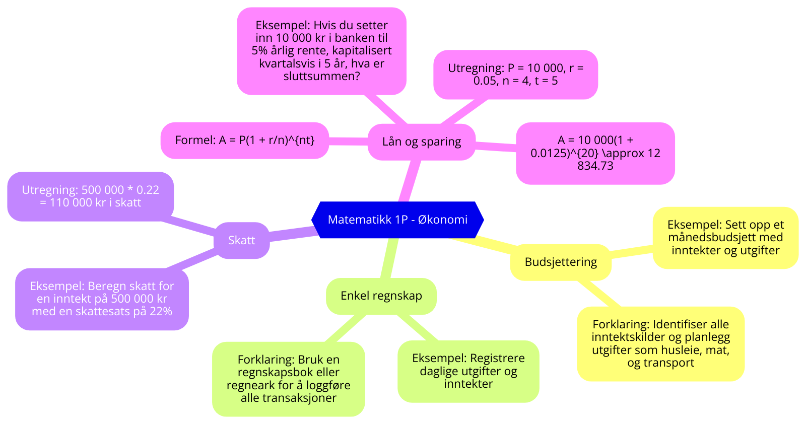 For å tilby reell læring med eksempler, formler, historie, forklaringer og kunnskap, vil jeg utvide hvert tankekart med disse elementene. La oss begynne med matematikk 1P og bygge ut hver seksjon.