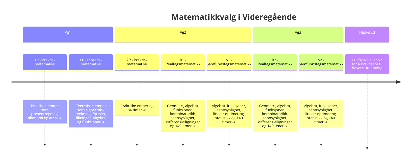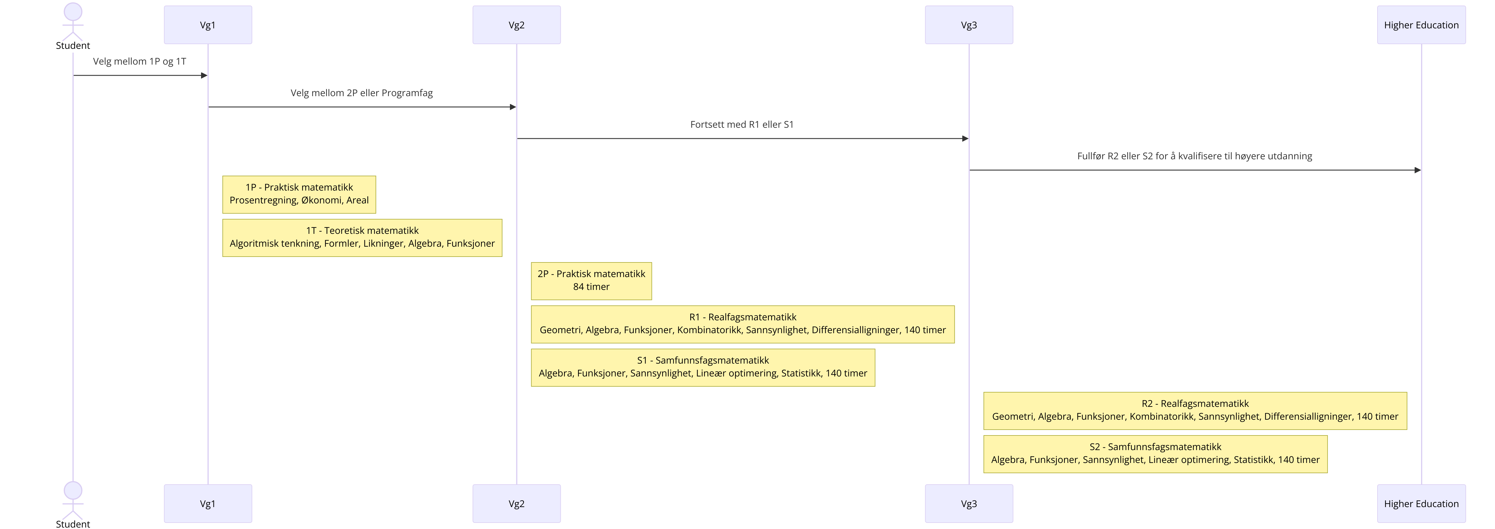 Her er sekvensdiagrammet som illustrerer valgene i matematikk gjennom videregående opplæring: