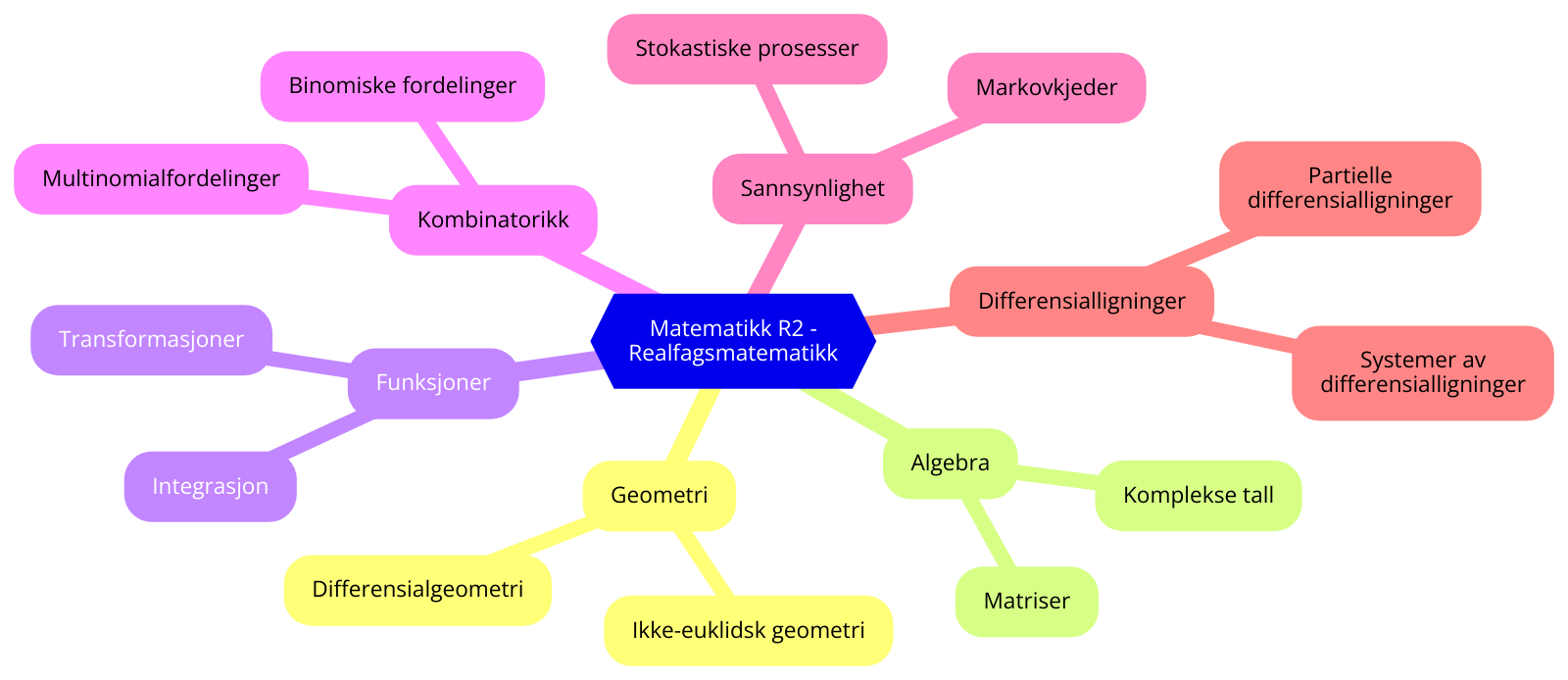 Jeg vil nå lage tilsvarende tankekart for matematikk R2 og S2 for å dekke alle fagene. Først begynner jeg med matematikk R2.