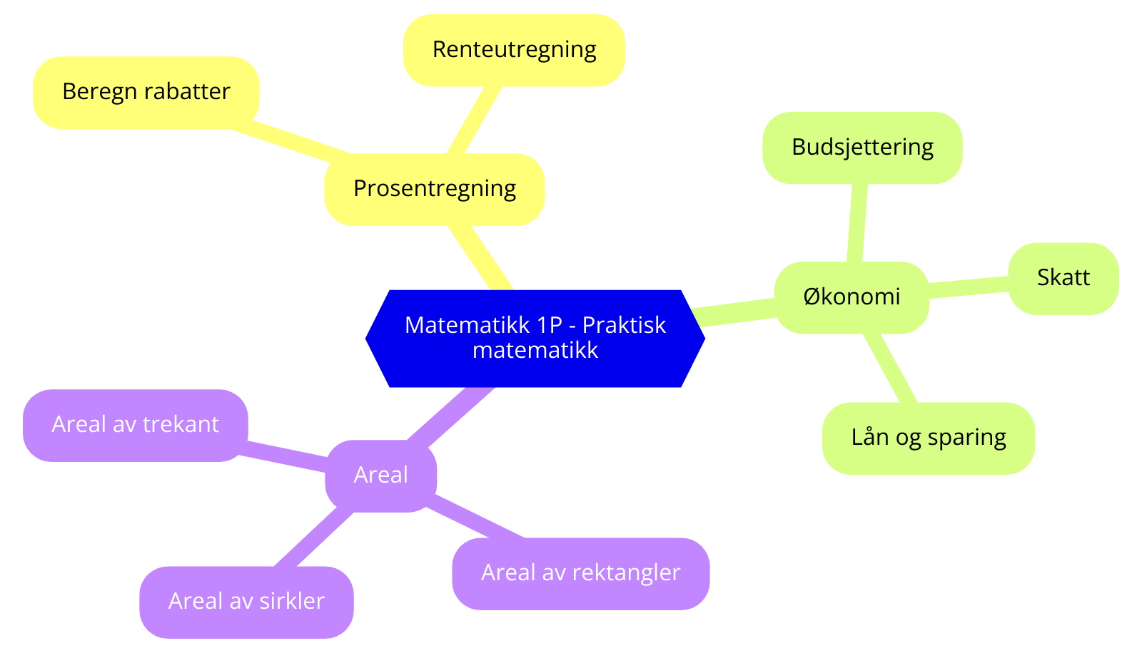 Her er tankekartet som viser en læringssti for matematikk 1P fra grunnleggende konsepter til avanserte konsepter: