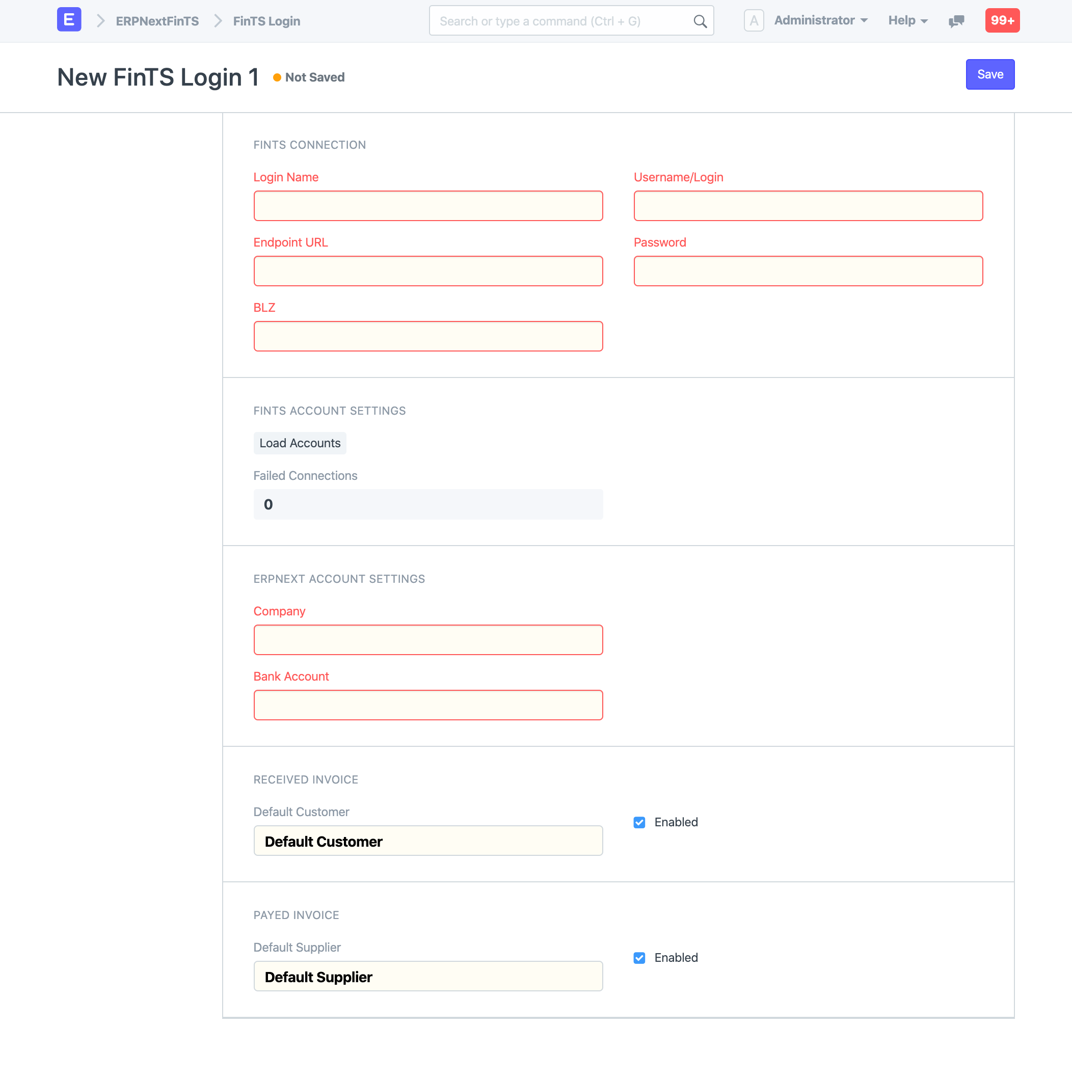 The "FinTS Login" doctype provides the necessary information to establish a FinTS connection and import the transactions into ERPNext as "Payment Entries"