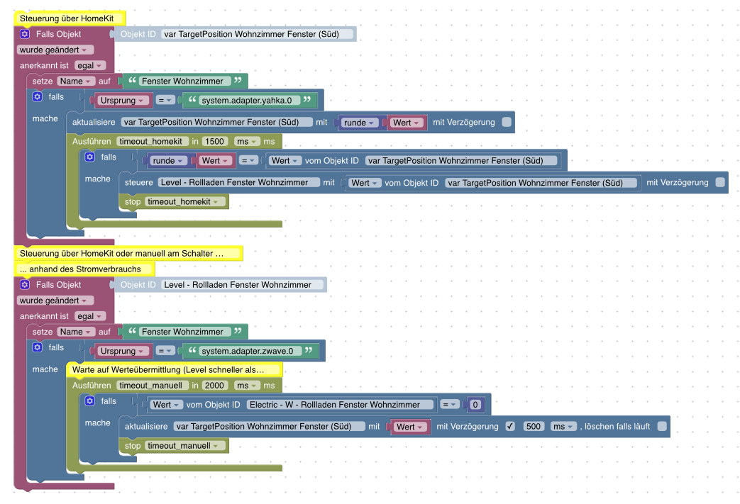 Ich habe hier meine Rollladensteuerung etwas komplexer als normal abgebildet, da es öfters zu Fehlverhalten gekommen ist. Das Problem haben nicht nur die Shutter von Devolo, auch Qubino und Fibaro sind davon betroffen - das es keinen Datenpunkt für die Richtung gibt und man eine manuelle Steuerung nur Anhand des Stromverbrauchs erkennt.
