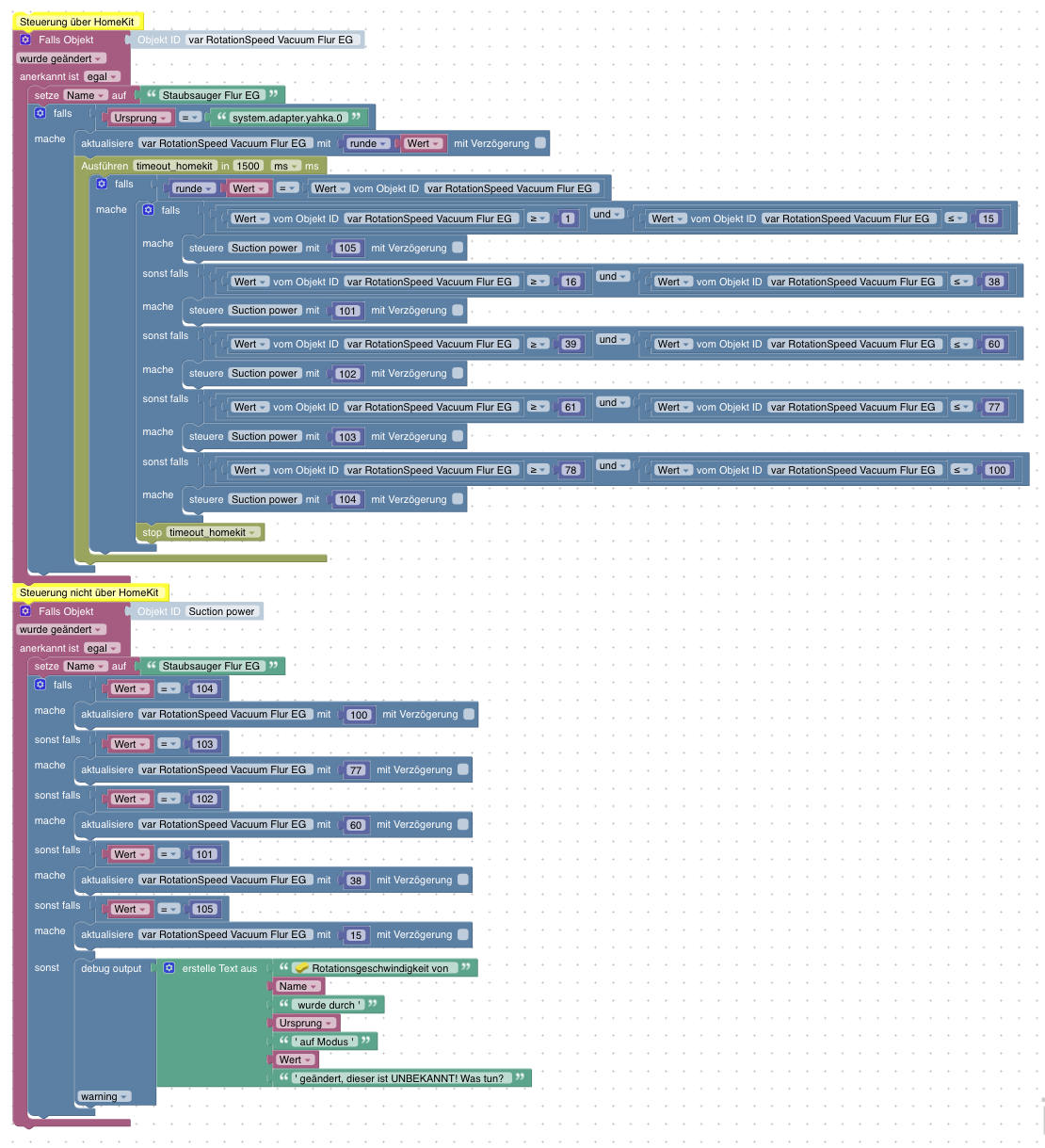 In meiner Konfiguration muss für jeden Staubsauger-Roboter ein Datenpunkt (number) erzeugt werden und ein Blockly Skript.