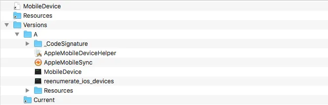 Having a look at the composition of MobileDevice we find that it is a framework composed of several binaries, with a main dylib and some utility executables. Some of those applications can actually be executed in the terminal, but we are going to focus in the MobileDevice dylib.