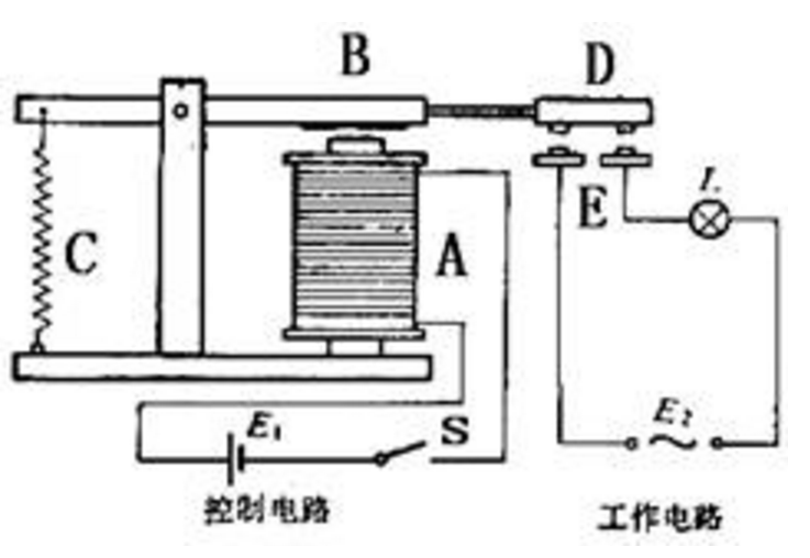 - 继电器工作时,电磁铁通电,把衔铁吸下来使D和E接触,工作电路闭合。电磁铁断电时失去磁性,弹簧把衔铁拉起来,切断工作电路。因此,继电器就是利用电磁铁控制工作电路通断的开关。