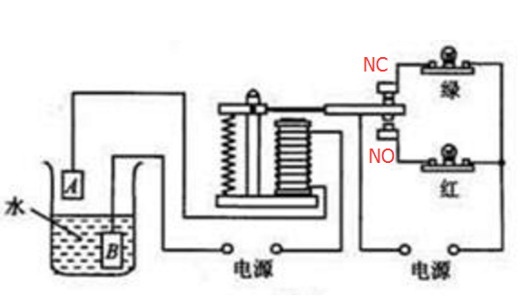 - 如下图是一种水位报警器的原理示意图,当水位到达金属块A时,电路中红灯会亮,如果没有达到水位,绿灯会亮。