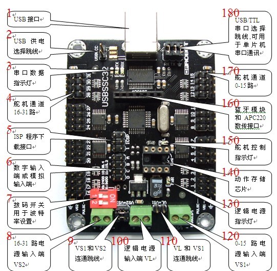 16 - 蓝牙模块和APC220数传接口:该接口是我们的USB版32路舵机控制器特有的,可以直接使用我们的蓝牙模块和APC220无线数传,构成无线远程控制;