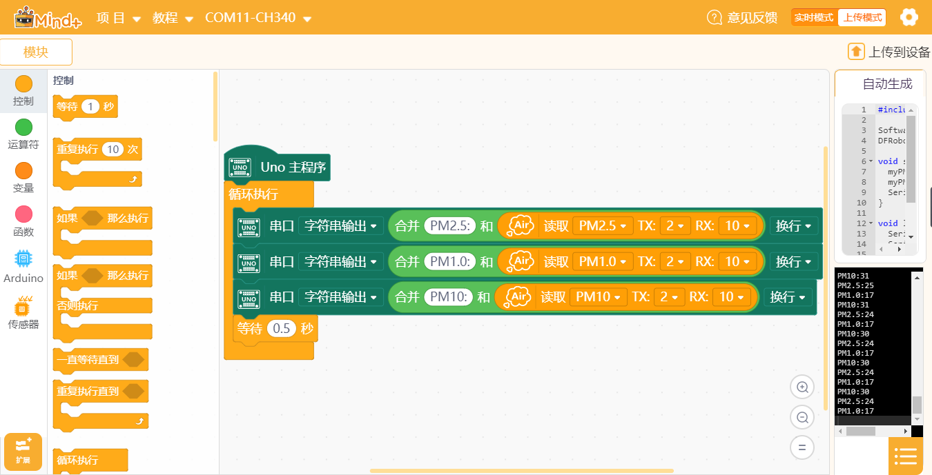 1、下载及安装软件。下载地址:http://www.mindplus.cc 详细教程:Mind+基础wiki教程-软件下载安装 2、切换到“上传模式”。 详细教程:Mind+基础wiki教程-上传模式编程流程 3、“扩展”中选择“主控板”中的“Arduino Uno”,“传感器”中加载“PM2.5激光粉尘传感器”。 详细教程:Mind+基础wiki教程-加载扩展库流程 4、进行编程,程序如下图: 5、菜单“连接设备”,“上传到设备” 6、程序上传完毕后,打开串口即可看到数据输出。详细教程:Mind+基础wiki教程-串口打印