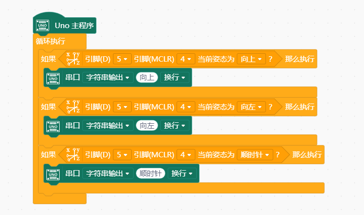 1、下载及安装软件。下载地址:http://www.mindplus.cc 详细教程:Mind+基础wiki教程-软件下载安装 2、切换到“上传模式”。 详细教程:Mind+基础wiki教程-上传模式编程流程 3、“扩展”中选择“主控板”中的“Arduino Uno”。 "扩展"“传感器”中搜索选择“3D手势传感器”。详细教程:Mind+基础wiki教程-加载扩展库流程 4、进行编程,程序如下图: 5、菜单“连接设备”,“上传到设备” 6、程序上传完毕后,打开串口即可看到数据输出。详细教程:Mind+基础wiki教程-串口打印